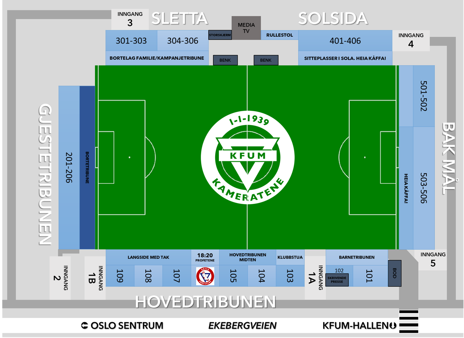 - Hovedtribunen er sitteplasser på langsiden under tak nærmest Ekebergveien.